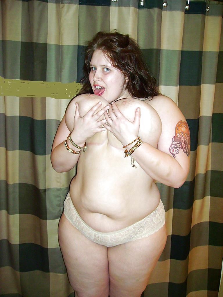Пухлая девушка с огромными сиськами показывает бритую киску